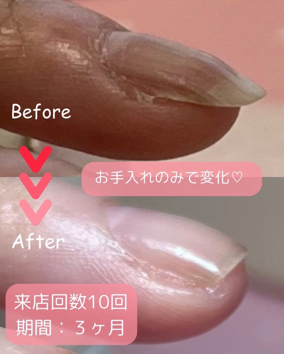 爪の形にコンプレックスがあり、手を見せるのが苦手だった方が、少しずつ自分の爪に自信を持てるようになります。